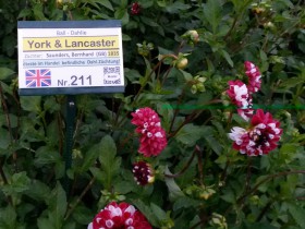 Unter anderem wurde dort eine rot-weiße Balldahlie "York & Lancaster" gezeigt, die als älteste noch verfügbare Dahliensorte aufgeführt war.